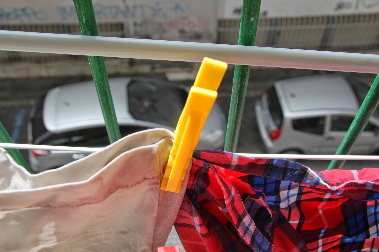 This wash will be dry by the time the next one is hung. Always try to hang in the middle of the day and in the sun, and not under any overhang where pigeons roost. And try never to drop a wet item on the balcony floor because you will need to wash it again. If you drop a pin down to the street level, someone will pick it up at some point and clip it to a fence or rail for you. If they’re walking by when it happens, sometimes they try and toss it up to you. This is always a hoot. It has to be the right kind of person, though. Most Italians are very blasé about everything that, to us, is fascinating. Like hanging laundry.